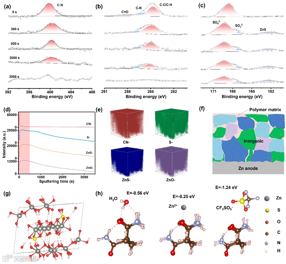 图3. 聚合物-无机杂化SEI的组成。(a-c)刻蚀不同时间的XPS图;(d)飞行时间二次离子质谱图;(e) 对应的三维分布图像;(f) SEI结构示意图;(g)DFT计算:Zn2+在ZHS中的扩散路径;(h)DFT计算:电解质不同组分与PAM聚合物间的相互作用。