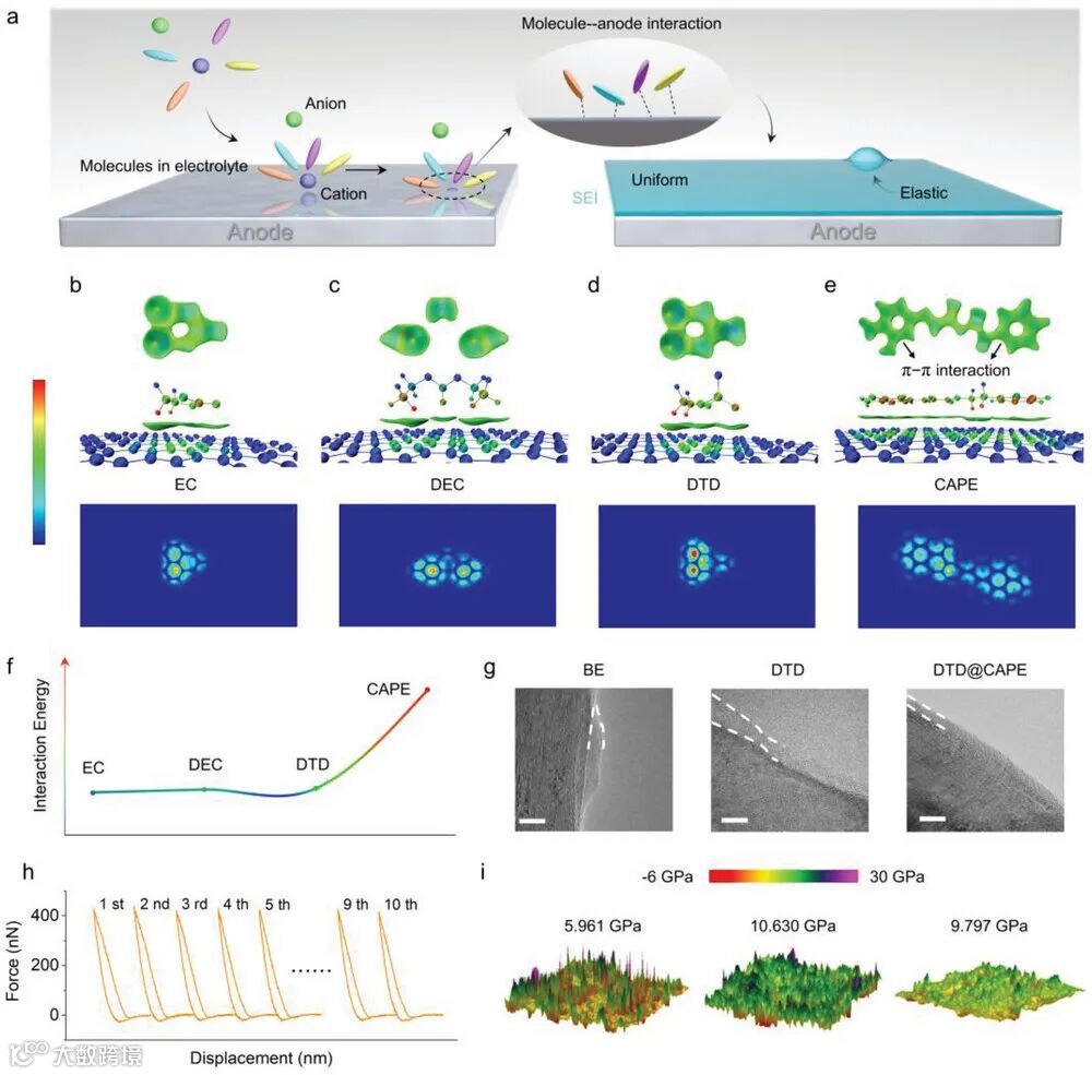图1. 分子与负极之间相互作用的理论计算和可视化绘图以及SEI性质的表征