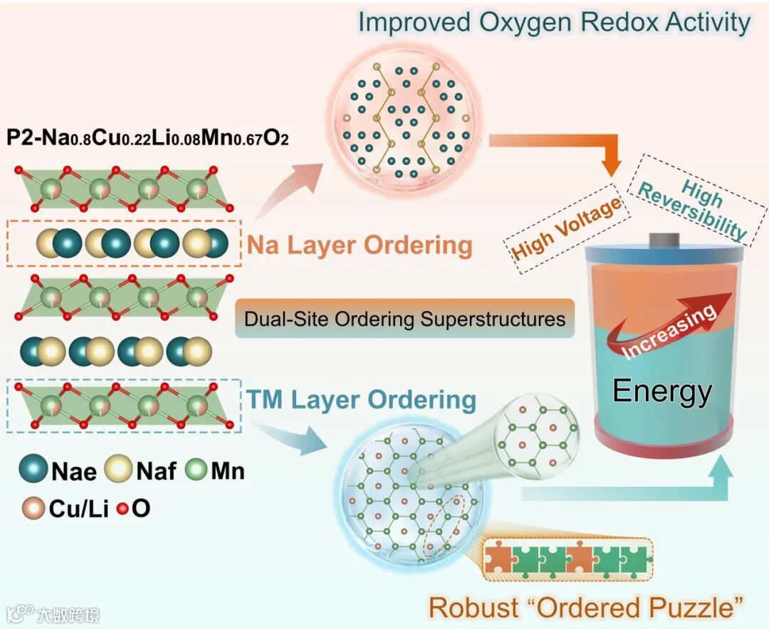 钠离子电池P2型层状过渡金属氧化物(NaxTMO2)正极材料因其高比容量、制备简便和组分设计灵活等优点而备受关注。大多数P2型氧化物中,Na+—Na+和Na+—TMn+的静电相互作用通常会导致Na+/空位有序。目前的研究普遍认为Na+/空位有序对结构稳定性和Na+扩散动力学有不利影响,并通过各种改性策略抑制Na+/空位有序,但其潜在优势仍是未知领域。通常,Na+/空位重排发生在高电压区间(3.2−3.7 V)的脱嵌钠过程中,同时伴随着额外的电压平台出现。因此,利用Na+/空位有序来提升氧化物正极的工作电压和能量密度,同时保持这种高能量的稳定输出具有很重要的意义,但也面临挑战。