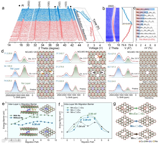 图4:a,b) NCLMO-12h材料的原位XRD图和相应的体积变化;c) 与其他P2型层状氧化物钠离子电池正极体积变化的对比图;d) NCLMO-12h、NCLMO-9h和NCLMO-15h材料在首周循环中的非原位7Li ss-NMR波谱,以及相应的过渡金属层结构演变示意图;e) Na7Li1Mn17O36和Na0Li1Mn17O36超胞中:层间Li离子迁移能垒和迁移路径示意图;f,g) Mn17□1O36、Mn16Cu1□1O36和Mn16□2O35超胞中:层内Mn离子迁移能垒和迁移路径示意图。