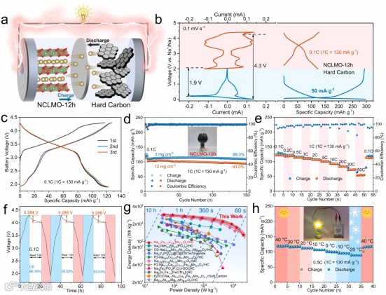 图5:a) NCLMO-12h正极和硬碳负极组装的钠离子全电池示意图;b)正极和硬碳负极的容量与CV对比图;c) 全电池充放电曲线图;d) 不同正极负载下的循环性能(插图为正极材料的规模制备图);e) 全电池的倍率性能;f) 全电池的自放电性能;g) Ragone图;h) 全电池的宽温域性能(插图为软包电池点亮LED灯照片)。