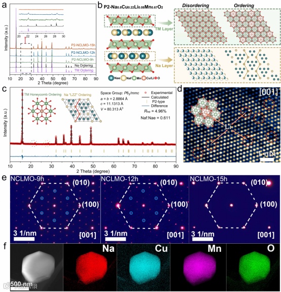 图1:a) NCLMO-9h、NCLMO-12h和NCLMO-15h材料的XRD图,以及TM蜂窝有序超结构和Na+/空位有序超结构的模拟XRD图;b) P2-Na0.8Cu0.22Li0.08Mn0.67O2的晶体结构示意图;c) NCLMO-12h的精修XRD图和d) HAADF-STEM图;e) NCLMO-9h、NCLMO-12h和NCLMO-15h样品的选区电子衍射图; f) NCLMO-12h的TEM-EDS mapping元素分布图。