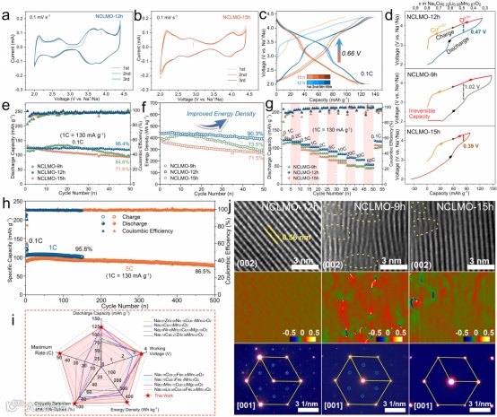 图2:a,b) NCLMO-12h和NCLMO-15h正极材料在0.1 mV s-1扫速下的CV曲线和c)在2.0-4.4 V电压范围内0.1C电流密度下的充放电曲线;d) NCLMO-9h、NCLMO-12h和NCLMO-15h在0.1C下的电压迟滞图;NCLMO-9h、NCLMO-12h和NCLMO-15h的e) 循环稳定性、f) 能量密度变化和g) 倍率性能;h) NCLMO-12h的长寿命循环性能;i) 与已报道的Cu-Mn基层状氧化物正极的电化学性能对比雷达图;j) NCLMO-9h、NCLMO-12h和NCLMO-15h在0.1C下循环50次后的HRTEM图及相应的几何相分析和选区电子衍射图。