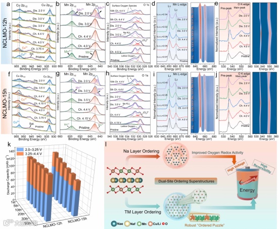 图3:NCLMO-12h和NCLMO-15h的非原位a,f) Cu 2p,b,g) Mn 2p,c,h) O 1s XPS能谱图,以及d,i) Mn-L边和 e,j) O-K边EELS能谱图;k) NCLMO-12h和NCLMO-15h在2.0-3.25 V和3.25-4.4 V电压范围内的放电容量演变对比;l) 双有序超结构提升电化学性能的示意图。