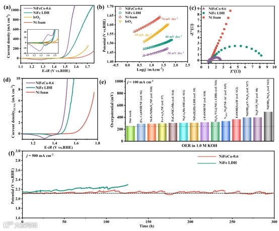 通过循环伏安(CV)测试了在1.0 M KOH电解液中催化剂的OER性能。在500和1000 mA cm-2电流密度下,重构后的NiFeCo-0.6 LDH所对应的过电位分别为318和353 mV,Tafel 斜率为38 mV dec-1,表现出了优异的析氧活性和反应动力学,且在500 mA cm-2条件下至少保持300 h的稳定性。此外,重构的NiFeCo-0.6析氧性能优于最近报道的大多数NiFe基材料。