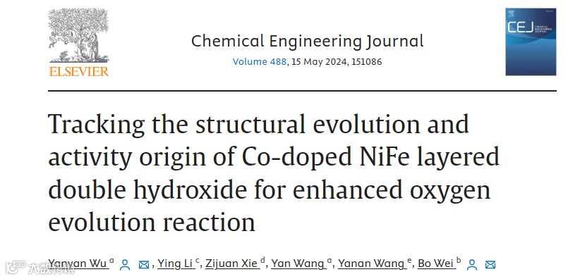 近日,沈阳师范大学毋妍妍和哈尔滨工业大学魏波合作,在国际知名期刊Chemical Engineering Journal上发表题为“Tracking the structural evolution and activity origin of Co-doped NiFe layered double hydroxide for enhanced oxygen evolution reaction”的文章。该文章通过多种原位表征技术追踪Co掺杂NiFe (NiFeCo) LDH在电催化过程中结构和成分的动态演变,揭示了Co掺杂降低了Ni的氧化电位,加速了高活性Ni(Co)1-xFexOOH的形成。另外,ICP-MS表明Co掺杂稳定了Fe局部配位环境,减缓其溶解,使NiFeCo-0.6电极具有优异的稳定性。重构的催化剂在100和500 mA cm-2的电流密度下,过电位分别为261和318 mV,且在1.0 M KOH条件下,在500 mA cm-2条件下至少保持300 h的稳定性。