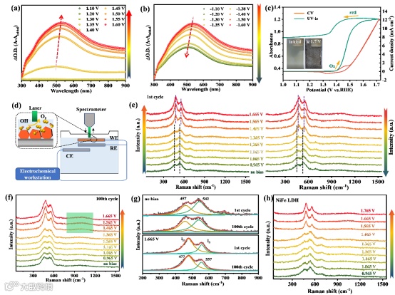 图3 (a-c)NiFeCo-0.6的原位紫外-可见光谱,(d)原位拉曼装置图,(e, f)NiFeCo-0.6在不同循环圈数下的原位拉曼光谱,(g)相同电位下的拉曼光谱,(h)NiFe LDH在不同电位下的原位拉曼光谱。