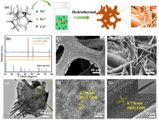 图1 (a)催化剂制备示意图,NiFe LDH和NiFeCo-0.6 LDH的(b)XRD图,NiFeCo-0.6 LDH的(c-d)SEM图和(e-f)TEM图。