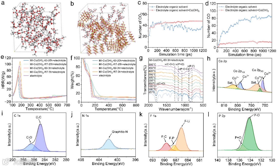 针对所制备负极材料的热稳定性,进行了一系列的测试。通过微型燃烧量热法(MCC)可以得到热释放速率随温度的变化,MI-Co(OH)2-60-3h+electrolyte的热释放速率峰值降幅为31.3%,说明制备的负极材料能够抑制电解液热分解时热量的释放。热重分析(TGA)说明,800℃时,MI-Co(OH)2和电解液的混合溶液的剩余质量比纯电解液多,表明该负极材料能够催化电解液溶剂分子成炭,有利于隔绝热量、氧气和烟气。