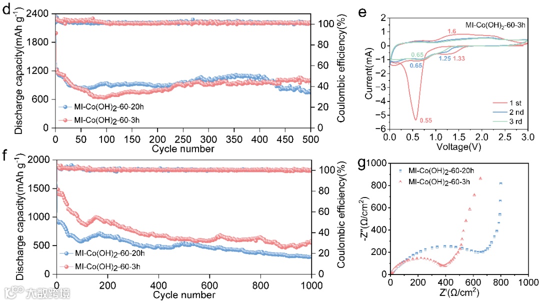 采用静电势(ESP)分析和密度泛函理论(DFT)计算研究了Co(OH)2和2-甲基咪唑的结构及动力学行为。模拟计算结果表明,2-甲基咪唑的最高占据分子轨道(HOMO)和最低未占据分子轨道(LUMO)的差值E明显小于电解液中的溶剂分子,说明与EC、DMC和EMC相比,2-甲基咪唑分子反应活性更高,这有利于其参与固体电解质界面(SEI)的形成,从而缓解电解液的过度分解。此外,咪唑分子的插入能够为锂离子提供更多的结合位点,提高锂离子与负极材料之间的结合能。MI-Co(OH)2-60-3h作为负极材料的锂离子电池,在电流密度为0.2 A g-1时,具有1992.37 mAh g-1的初始放电比容量,循环500圈后,仍然具有997.91 mAh g-1的放电比容量。在电流密度为0.5 A g-1时,尽管有一些初始的容量衰减,但循环后期相对稳定,1000圈循环后保持549.06 mA g-1的放电比容量。