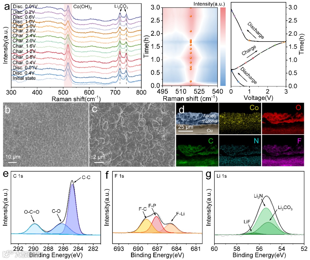 在锂离子电池循环过程中,通过原位拉曼研究了充放电行为对负极材料所造成的影响。717 cm-1和743 cm-1处的两个峰属于Li2CO3,是EC/DMC/EMC与Li+反应所生成的,是SEI膜的其中一个组分。在整个充放电过程中,这两个峰的位置都没有发生偏移,说明已经生成了较为稳定的SEI膜。对循环之后的电池进行拆解,负极表面和截面的元素分布表明生成了Li3N,即咪唑分子参与了SEI的生成,优化了SEI的组成,从而可以减轻电解液的过度分解,延长电池的使用寿命。