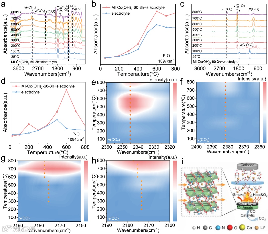 燃烧过程中产生的烟雾是发生火灾时导致死亡的关键因素。利用热重红外(TG-IR)分析了热解过程中气体产物的组成,图中1280cm-1处出现-C-O-C-不对称伸缩振动峰,1774cm-1处出现C=O伸缩振动峰,2969cm-1处出现-CH3不对称伸缩振动峰,以上几种基团可以对应到电解液中EC、DMC和EMC三种有机溶剂分子。热分解后,200℃出现了P-O(1097cm-1)、 C=O(1870cm-1)特征峰,300℃出现了CO2 (2381cm-1)、CO(2179cm-1)特征峰。从不同温度下CO2和CO吸收峰强度随温度和波数变化的云图可以看出,MI-Co(OH)2-60-3h和电解液的混合物高温下CO2的释放量明显大于纯电解液。并且在600℃之前,MI-Co(OH)2-60-3h和电解液的混合物释放的CO更少。说明MI-Co(OH)2-60-3h高温下转变成钴氧化物并与电解液发生反应,能够催化CO转化成CO2,对电解液热分解释放CO气体有一定的抑制作用,能够减少有毒气体的释放。