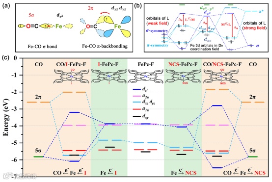 当CO化学吸附于Fe中心时,分析CO与Fe之间的轨道相互作用发现,Fe-CO反馈π键减弱了CO的C≡O键,由此推断增强Fe-CO反馈π键能进一步促进*CO活化。以FePc-F为Fe-N4位点的分子模型,通过理论计算分析了不同场强的轴向配体配位的FePc-F(L-FePc-F)的Fe中心电子结构的差异。结果表明,弱场/强场配体与Fe-N4位点的轴向配位分别通过提高/降低Fe 3dxz/dyz轨道能级增强/减弱了L-FePc-F的Fe-CO反馈π键。另外,弱场配体向Fe中心的电子转移(如I→Fe)和Fe中心向强场配体的电子转移(如Fe→NCS)分别促进和阻碍了电子由Fe中心向*CO转移(即Fe→*CO),这分别进一步增强/减弱了L-FePc-F的Fe-CO反馈π键。