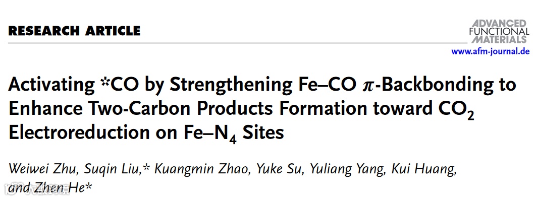 近日,中南大学刘素琴教授、何震教授在国际知名期刊Adv. Funct. Mater.上发表了题为“Activating *CO by Strengthening Fe-CO π-Backbonding to Enhance Two-Carbon Products Formation toward CO2Electroreduction on Fe-N4 Sites”的研究性论文。该论文通过轴向配体与Fe-N4位点的配位调控Fe-CO反馈π键以促进*CO活化,不仅提高了Fe-N4位点催化CO2还原的C2产物选择性,而且揭示了M-N4位点电子结构与C2产物选择性之间的“构-效”关系。