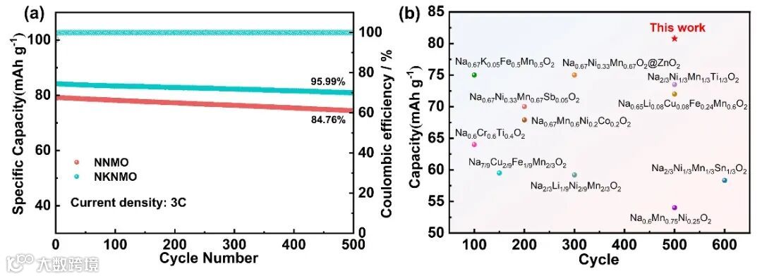 掺杂K+ 的样品展示出了优异的循环稳定性,在3C下循环500圈后容量保持率在95.99%。