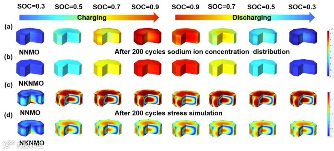 图3 COMSOL模拟200圈循环后材料Na+浓度分布图和应力模拟图