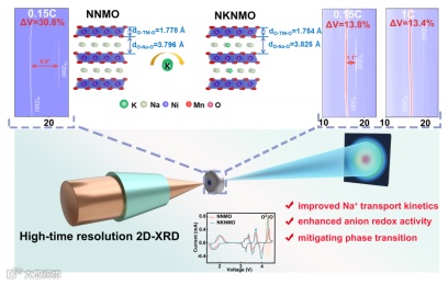 通过先进的高时间分辨2D-XRD直接揭示了材料在不同倍率循环过程中的动态相变过程。NKNMO在低倍率(0.15C)和高倍率(1C)循环过程中均表现出减轻的有害相变和明显减少的体积收缩。钠层的K+ 作为支柱可以有效地缓解应力积累,从而提高结构稳定性和倍率性能,并保持良好的循环可逆性。