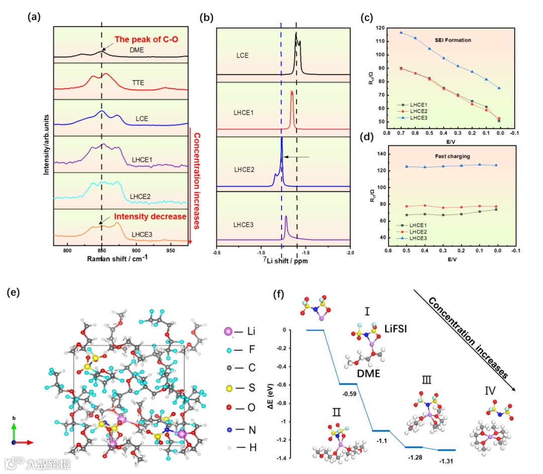 拉曼图谱和核磁共振图谱的结果表明,随着浓度的增加,需要配位的Li+增多,电解液中的DME溶剂分不足,FSI-更多的参与到Li+配位中。计算结果表明,Li+附近基本没有TTE分子,Li+主要与FSI-或DME分子进行配位,Li+通常形成三配位或四配位结构。LHCE1浓度高于传统电解质,部分FSI-参与Li+配位,形成Li+与1个FSI-和2个DME分子配位的配位结构,随着LHCE2浓度的增加,更多的FSI-参与Li+的配位。当浓度逐渐增加,LHCE3可能会出现一个Li+与两个DME分子的四个氧原子配位的溶剂化构型,具有最大的结合能,导致LHCE3的Li+脱溶剂化能最高。