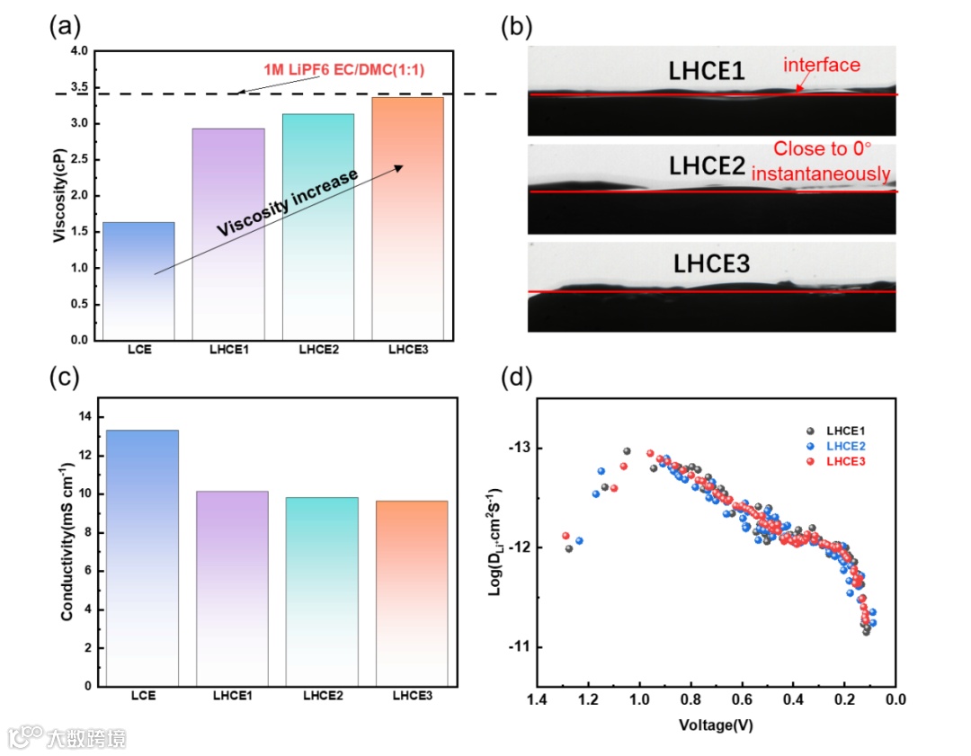 为了探究LHCE2相比于LHCE1和LHCE3具有更好倍率性能的原因,首先测试了不同电解质的粘度和离子电导率。由于稀释剂的存在,即使是最高浓度的LHCE3的粘度也低于传统的非水电解质(1 M LiPF6/EC/DMC)。并且对3种LHCE进行了接触角测试,电解液在接触后立即在电极表面扩散,三种LHCE都没有明显的接触角,均具有较好的润湿性。本文还对电解液的离子电导率进行了测试,电解液的离子电导率并不是随浓度单调增加的,最大电导率是载流子数量和这些载流子的离子迁移率之间权衡的结果。还进行了恒流间歇滴定技术(GITT)测试,结果表明三种电解液在石墨体相内的扩散速率差异很小。综上所述,三种电解液的Li+在电解液体相或石墨体相内的传输行为差异并不明显,不是造成三种电解液快速充电性能显著差异的原因。
