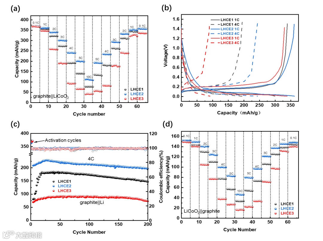 从倍率性能来看,在较低的速率下,三种电解液之间的容量差异不明显。然而,在高倍率下LHCE2的容量明显高于其他两种电解液。使用LHCE1、LHCE2和LHCE3电解液的石墨/锂电池的容量在4 C时分别为192、242和95 mAh/g。从循环稳定性上看,采用LHCE2的石墨/锂电池在4 C高倍率下具有良好容量保持率,即使在200次循环后仍保持92.1%的容量保持率。可以看出,在1 C时采用三种电解液的电池初始容量没有明显差异,然而在高倍率下,只有LHCE2具有较高的初始容量和优秀的容量保持率。