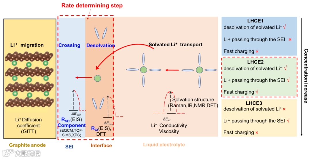 图1. 石墨负极在局域高浓度电解液中的决定速率步骤示意图。