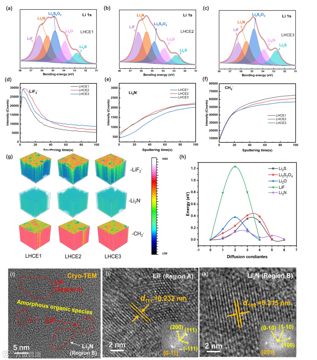 XPS和TOF-SIMS的结果表明,采用LHCE2、LHCE3的石墨负极表面生成的SEI组分中无机组分Li3N和LiF的含量明显多于LHCE1,这主要是由于LHCE2和LHCE3溶剂化结构中有更多的FSI-参与Li+的配位,使得在生成SEI的过程中FSI-优先分解,形成更多的无机组分。离子迁移能的计算结果表明,Li3N在生成的SEI组分具有最低的离子迁移能,而LiF中Li+可通过晶界传输也拥有较好的Li+传输能力,因此LHCE2和LHCE3的SEI阻抗明显小于LHCE1。因此,LHCE1所形成的SEI具有较差的Li+传输能力,是导致其快速充电能力较差的主要原因。