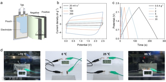 图6. 强弱耦合型电解液软包超级电容器。(a) 软包超级电容器的组装示意图;(b) CV 曲线;(c) GCD 曲线;(d) 单片袋状器件可在 -70°C、0°C、25°C 和 80°C 时为数字温度计供电。