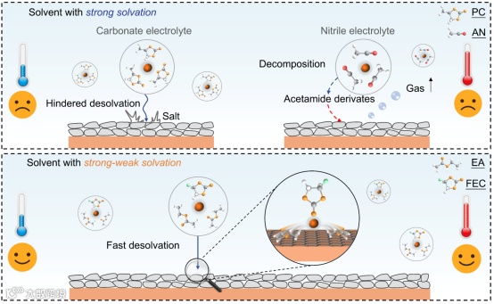 图1. 传统电解液和强弱耦合型电解液的第一溶剂化壳层结构和界面处的去溶剂化过程示意图。