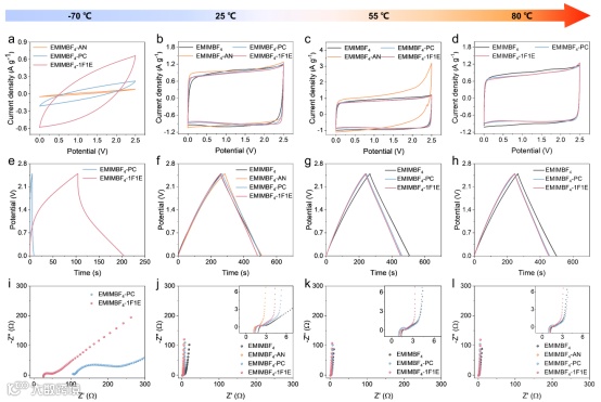 图4. 基于 EMIMBF4、EMIMBF4−AN、EMIMBF4−PC 和 EMIMBF4−1F1E的 SC 的电化学性能。(a) −70 °C、(b) 25 °C、(c) 55 °C 和 (d) 80 °C 时的 CV 曲线。(e) −70 °C, (f) 25 °C, (g) 55 °C 和 (h) 80 °C 时的 GCD 曲线。(i) −70 °C, (j) 25 °C, (k) 55 °C 和 (l) 80 °C 时的 EIS 图。