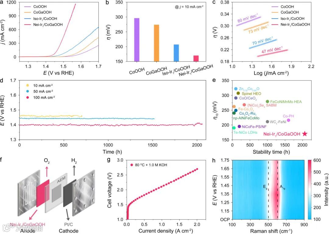 为了探究高密度单原子的近邻协同效应,我们评估了系列催化剂的OER性能。结果表明,Nei-Ir1/CoGaOOH的OER性能相较于Iso-Ir1/CoOOH显著提升,其达到10 mA cm-2电流密度时所需的过电位仅为170 mV,并且展现出超过2000 h(约83天)的稳定性(图4a-e)。此外,催化剂在碱性水电解槽中以1 A cm-2的电流密度稳定运行超过50小时(图4f-g)。原位拉曼实验则表明,催化剂在OER过程中保持结构稳定(图4h)。
