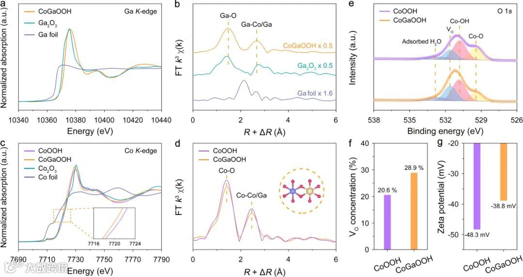通过液相合成法将Ga原子引入CoOOH,研究Ga原子对Co原子和氧缺陷位的影响。XAFS的结果表明,Ga原子位于CoOOH的晶格位,并且降低了Co原子的价态(图2a-c)。XAFS、XPS和Zeta电位的结果表明,Ga原子的引入不但显著提升了CoGaOOH的氧缺陷位浓度,并且还提高了催化剂表面的正电荷密度(图2d-g)。