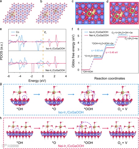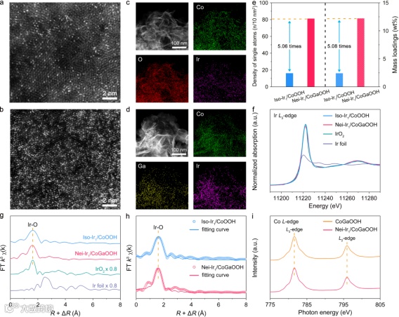 采用电化学阳极沉积技术,将Ir单原子锚定到CoGaOOH表面的氧缺陷位。结果表明,相较于Iso-Ir1/CoOOH,Nei-Ir1/CoGaOOH表面的单原子密度显著提升(图3a-d)。进一步的定量分析表明,Nei-Ir1/CoGaOOH表面的单原子密度是Iso-Ir1/CoOOH的5.06倍,质量负载量是Iso-Ir1/CoOOH的5.08倍(图3e)。XAFS证明了催化剂表面的Ir单原子具有相似的价态和几何构型(图3f-h)。此外,XAS的结果表明锚定的Ir单原子并没有对Co物种的价态产生显著影响(图3i)。