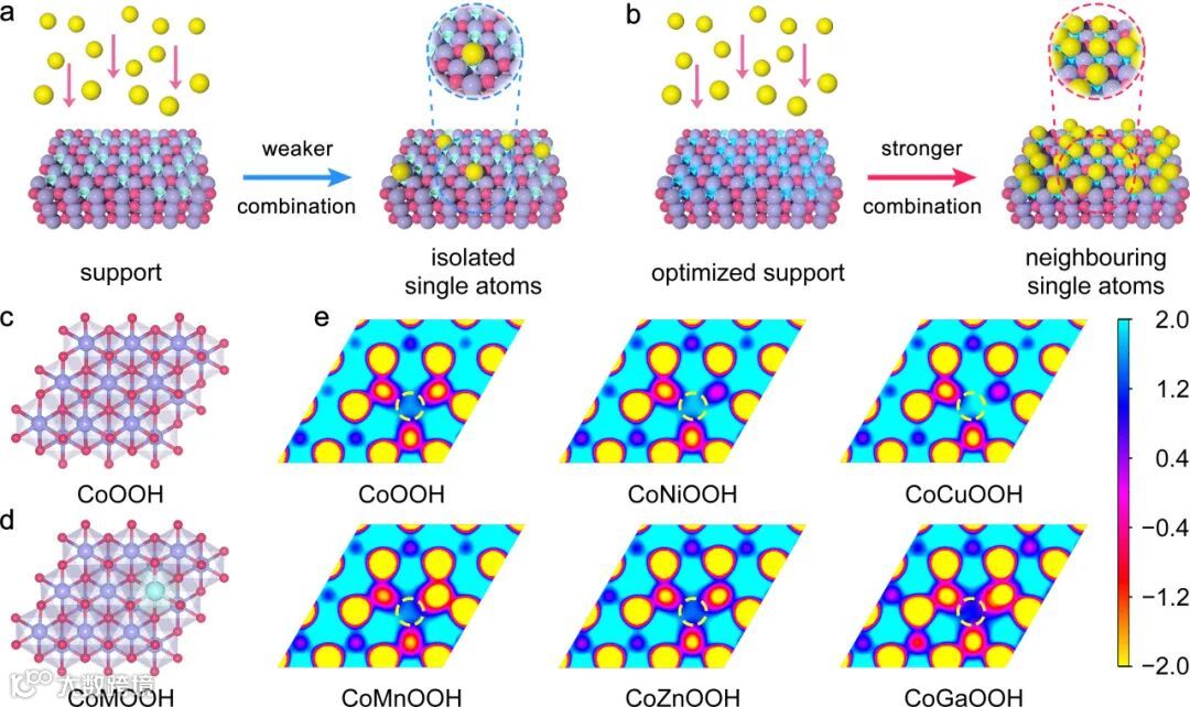 锚定位点和单原子前驱体之间的结合强度决定了氧化物表面单原子的密度。以氧缺陷位为例,通过提升氧缺陷位的正电荷密度,可以增强氧缺陷位和带负电的单原子前驱体之间的结合强度,从而显著提高单原子的密度(图1a,b)。结果表明,相较于引入其他3d金属原子,Ga原子的引入会诱导CoOOH表面的氧缺陷位电子离域,使其具有最大的正电荷密度(图1c-e)。