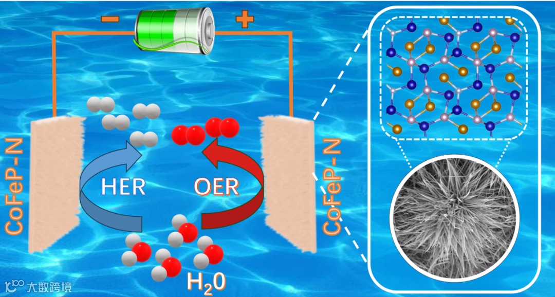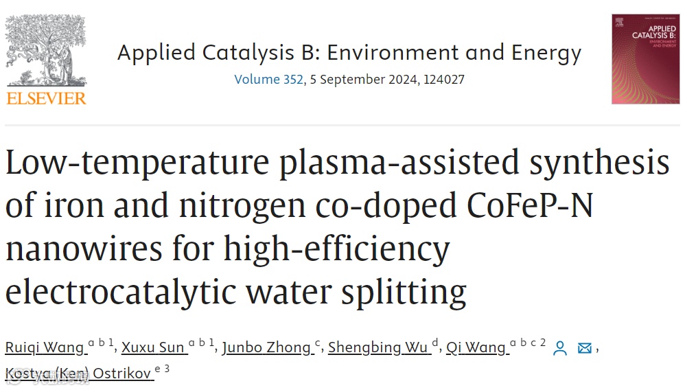 近日,中国科学院合肥物质科学研究院王奇教授课题组在国际知名期刊Applied Catalysis B: Environment and Energy上发表了题为“Low-temperature plasma-assisted synthesis of iron and nitrogen co-doped CoFeP-N nanowires for high-efficiency electrocatalytic water splitting”的研究论文(DOI: /10.1016/j.apcatb.2024.124027), 探究了元素掺杂对过渡金属基纳米复合材料在电催化水分解应用中的影响。该文通过水热、磷化和低温等离子体三步合成方法,成功制备了用于析氢和析氧的双功能铁、氮共掺杂CoFeP-N纳米线。铁原子的掺杂可以与钴原子形成协同效应,改变电催化剂的电子结构,增强其本征活性,获得优于单一金属磷化物的HER和OER活性。等离子体处理引入氮元素以提高催化剂的导电性,并向电极材料提供额外的电子,从而提高电极的电子转移速率。此外,CoP3和FeP2之间形成的非均相界面可以作为活性反应中心,对提高HER和OER的性能起着重要作用。