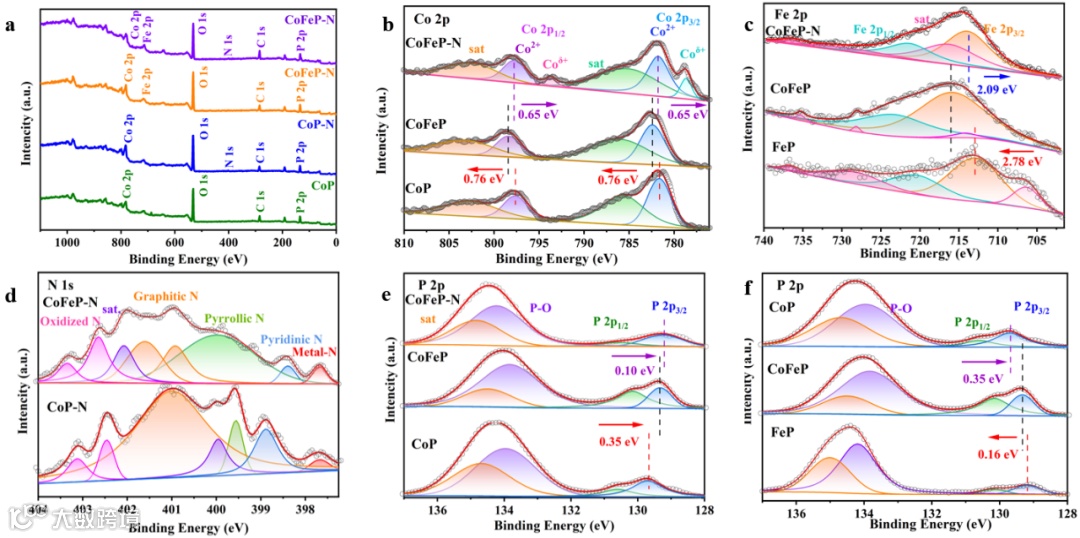 在XPS中,与纯FeP相比,CoFeP中的P 2p3/2和P 2p1/2的峰表现出正偏移,而与纯CoP相比,它们表现出负偏移。结合能的变化表明,CoFeP中CoP2和FeP2之间界面的强相互作用导致电荷再分配,这可以大大提高电催化活性。CoP3和FeP2之间形成的异质界面可以作为反应活性中心,对提高HER和OER的性能起着重要作用。