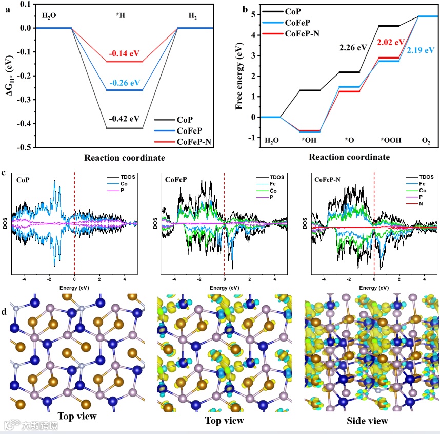 在XPS中,此外,相比于未经过等离子体处理的材料CoFeP, 通过等离子体处理的CoFeP-N材料的Co 2p3/2和2p1/2轨道负移了0.65 eV,Fe 2p3/2和2p1/2负移了2.09 eV,P 2p3/2和2p1/2轨道负移了0.10 eV。这一现象表明,经过氮等离子体的处理,在等离子体放电过程中产生的许多自由电子被样品捕获,从而使Co、Fe、P获得了电子。同时,归因于氢等离子体的还原作用,CoFeP-N中的一部分Co2+被还原为Coδ+。这种原子电荷的重新排布可以有效地提高电催化活性。通过理论计算表明,等离子体掺杂的氮原子提供了额外的电子,有利于提高材料的导电性。同时CoFeP-N催化剂的电子积累和消耗主要发生在N原子附近,表明N元素的引入可以促进电子转移,改变材料内的电荷分布。丰富电子的积累可以促进HER反应的发生,而电子转移诱导的过渡金属磷化物中空穴的积累反过来可以用来吸附OER中间体,从而加速HER和OER反应。