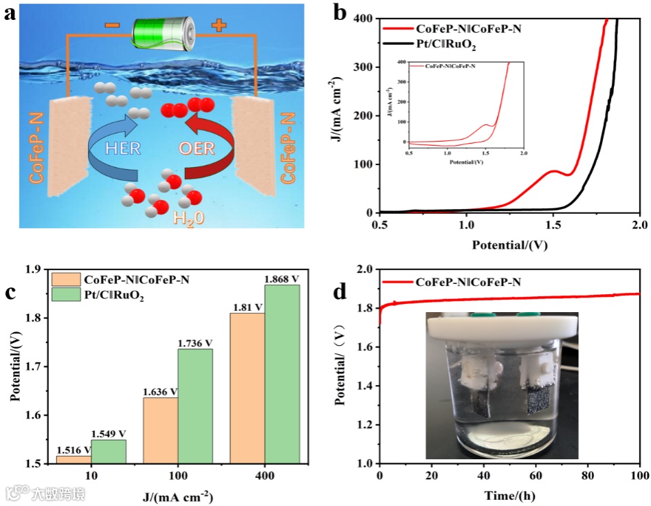 电化学HER和OER测试表明,CoFeP-N纳米线具有优异的电催化水分解活性。以1 M KOH水溶液为电解液,在HER和OER反应中,CoFeP-N分别仅需要64 mV和219 mV就可以达到10 mA cm-2的电流密度,以及80.02 mV dec-1和56.08 mV dec-1的低Tafel斜率,并且表现出优异的循环稳定性。此外,使用CoFeP-N纳米线同时作为阴极和阳极组装而成的双电极水电解系统分别在1.516 V和1.636 V的低电压下便可提供10 mA cm-2和100 mA cm-2的电流密度,远超商业Pt/C||RuO2电解池,同时也表现出优异的长期稳定性。