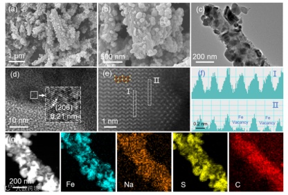 通过EPR测试发现NFS-1存在结构缺陷或空位,通过球差电镜进一步确定空位为Fe空位。这是因为掺杂的钠离子尺寸较小,无法完全填补铁离子的位置,导致晶格畸变,使部分铁原子失去配位离子,从而产生了铁空位。