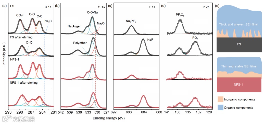 通过C 1s和O 1s光谱的刻蚀前后变化表明,NFS-1具有比FS更薄且更均匀的固体电解质界面膜(SEI),无机成分含量更高(NaF、NaP等),从而实现了卓越的电化学性能。这种SEI膜的形成得益于钠离子掺杂,其诱导作用促使含钠成分有序生长,缓解电解质的分解,提高电池的循环稳定性。
