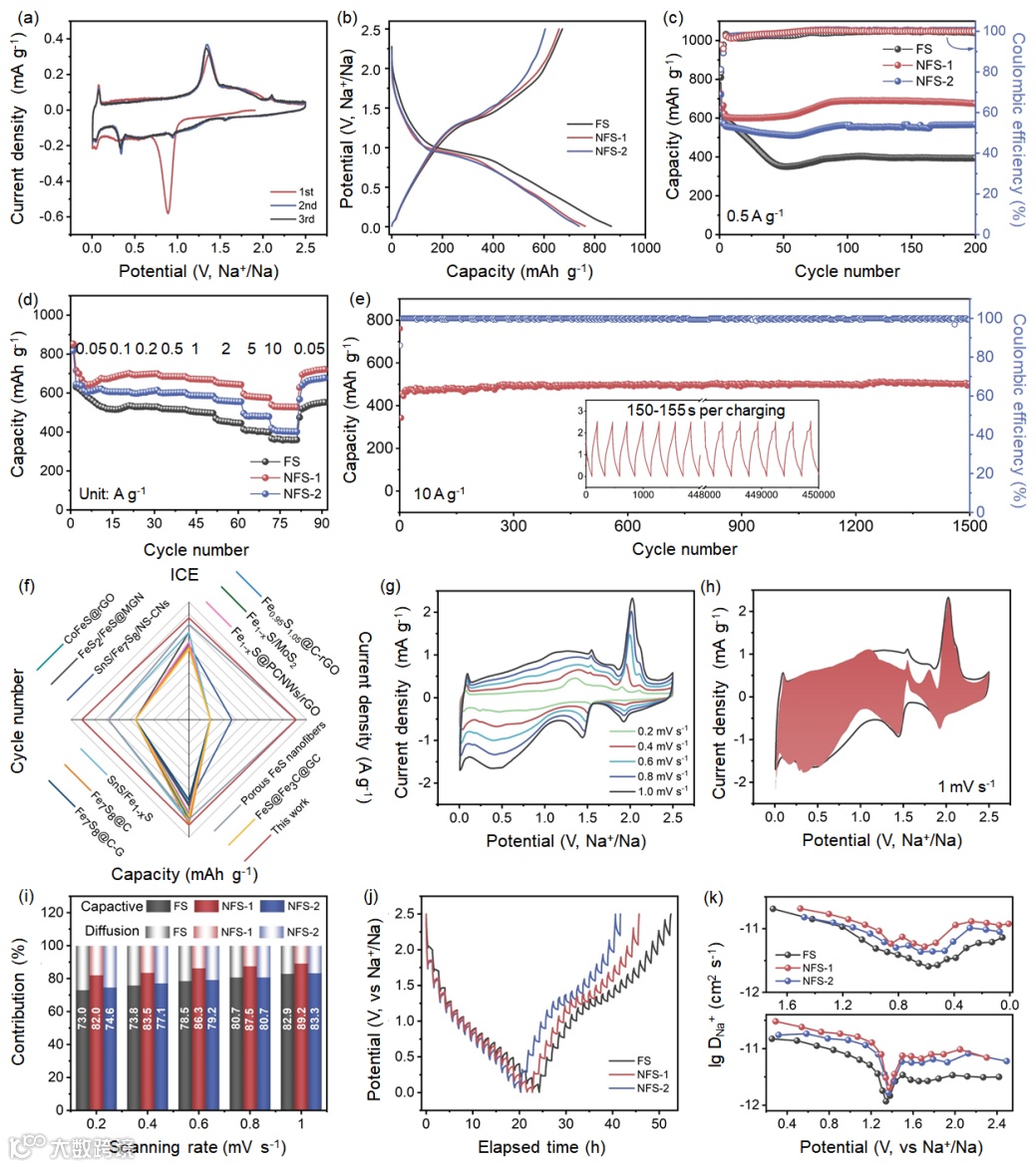 NFS-1的首次放电和充电容量分别为762和659 mAh g-1,初始库仑效率为86.46%。经过200个循环后,NFS-1电极仍保持674 mAh g-1的放电比容量,明显优于NFS-2和FS电极。此外,NFS-1在不同电流密度下展现出较高的比容量,并且在高达10 A g-1的电流密度下,电极充放电仅需150-155秒,在1500次循环后仍保持503 mAh g-1的高比容量。