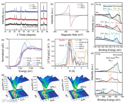 NFS-1和NFS-2的最强的衍射峰向左移动,表明受到钠离子掺杂影响的晶格参数扩大。通过EPR测试发现两种钠离子掺杂样品均存在结构缺陷或空位。高分辨率的Fe 2p光谱显示,707.1 eV处的峰强度下降,代表Fe-S键的减弱。S 2p光谱验证了这一推测,161.3 eV处的拟合峰对应M-S键,同样显示受钠离子影响而强度下降。NFS-1和NFS-2的Fe-S键长度从2.181 Å增加到2.355和2.316 Å,表明Fe-S键强度有明显减弱。