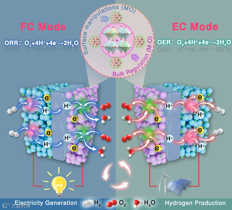 图1. R-PCEC两种工作模式(燃料电池和电解池)及其空气电极的体相和表面协同改性策略示意图。