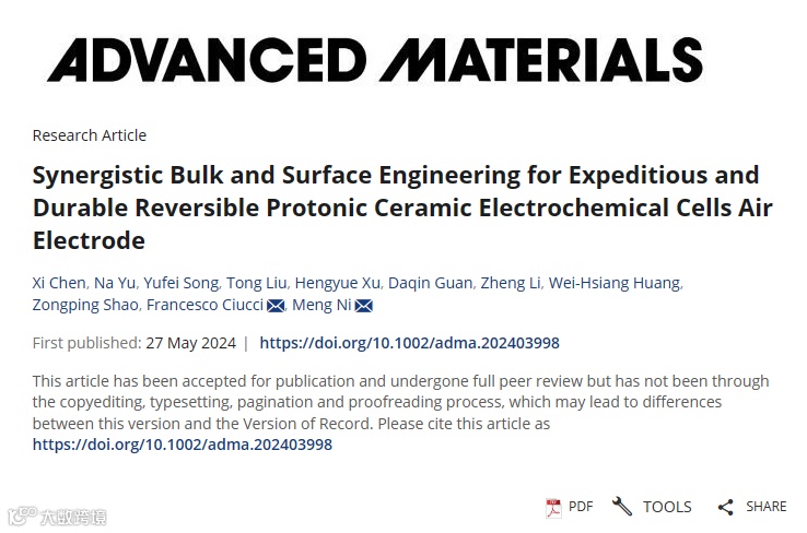 近日,香港理工大学的倪萌教授与香港科技大学的Francesco Ciucci教授合作,在国际知名期刊Advanced Materials上发表题为“Synergistic Bulk and Surface Engineering for Expeditious and Durable Reversible Protonic Ceramic Electrochemical Cells Air Electrode”的文章。该研究提出了一种同步优化钙钛矿氧化物表面反应位点和体相氧离子/质子迁移的新方法,以增强R-PCECs双功能空气电极的ORR/OER催化活性和稳定性。这为实现高性能R-PCECs空气电极提供了一种实际可行的设计新策略,有望加速高效能量转换和存储技术的发展。