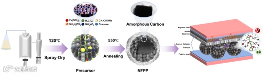 图1. 喷雾干燥法制备Na3.95Fe2.95V0.05(PO4)2P2O7的实验流程。