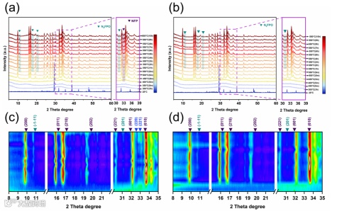 图2. (a) NFPP/C和(b) V0.05-NFPP/C温度烧结过程的x射线衍射图及(c, d)相应的等高线图。
