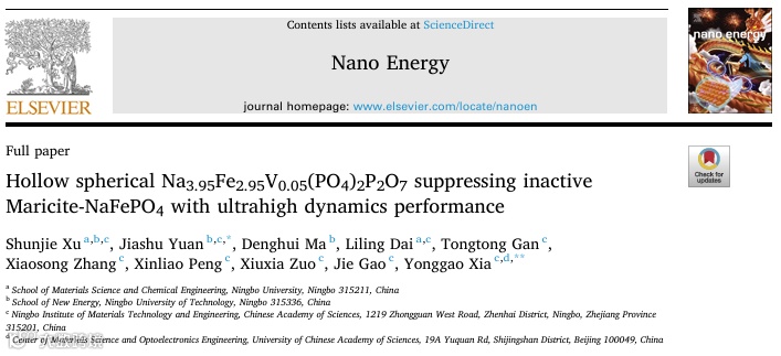 近日,来自中国科学院宁波材料技术与工程研究所的夏永高研究员与宁波工程学院的元家树博士合作,在国际知名期刊Nano Energy上发表题为“Hollow spherical Na3.95Fe2.95V0.05(PO4)2P2O7 suppressing inactive Maricite-NaFePO4 with ultrahigh dynamics performance”的研究型文章。该文章提出了利用电化学活性的钒离子取代铁离子来提高NFPP的可逆容量,在改善钠离子在NFPP中的动力学性能的同时,抑制非活性M-NFP相的形成。