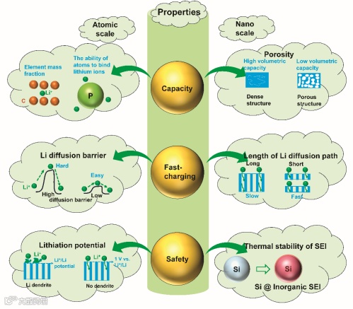 在过去三十年中,锂离子电池(LIBs)取得了快速进展,并广泛应用于计算机、通信设备、消费电子、电动汽车和储能系统。关键在于降低成本和提升电池材料性能,特别是负极材料的设计。硅(Si)和磷(P)作为非金属负极材料,具有高比容量,但因导电性差和体积膨胀问题,需通过纳米技术和复合材料策略改善。快速充电性能主要受锂离子在负极表面的迁移和扩散影响,缩小材料尺寸有助于提高倍率放电性能,但也可能增加SEI形成和锂损耗。安全性则与负极的SEI和锂沉积相关,高锂化电位有助于提高安全性,但会降低能量密度。综合考虑比容量、倍率性能和安全性,负极材料的发展需在实现高性能的同时,简化工业生产工艺,以满足电子产品和电动汽车的实际应用需求。