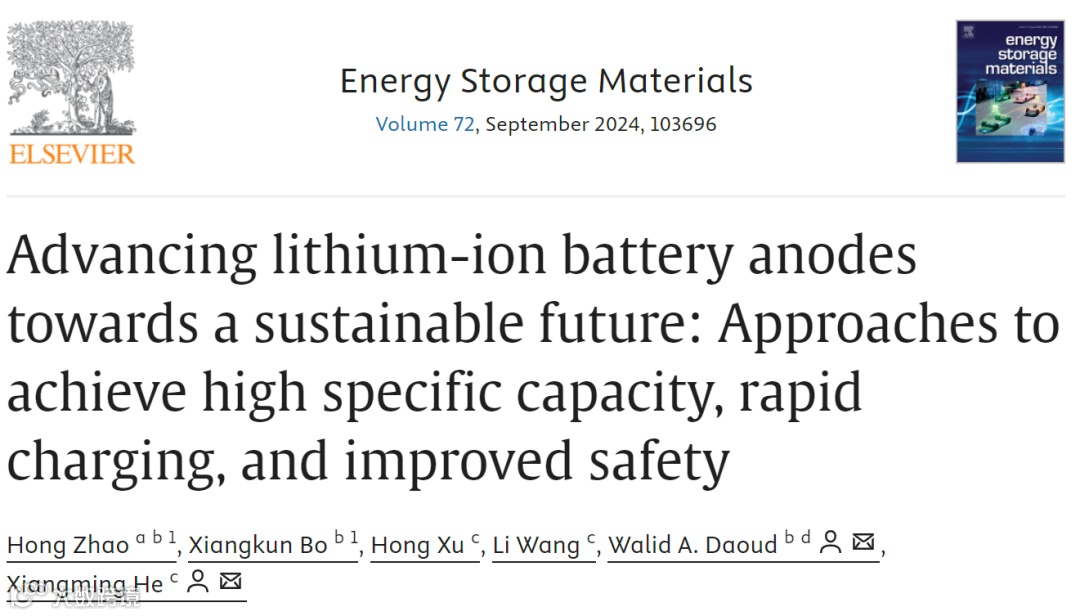 近日,来自清华大学的何向明教授与香港城市大学的Walid A Daoud教授合作,在国际知名期刊Energy Storage Materials上发表题为“Advancing lithium-ion battery anodes towards a sustainable future: Approaches to achieve high specific capacity, rapid charging, and improved safety”的综述文章。该综述文章介绍了现在常用的先进负极材料的局限性和应对策略,总结了实现高比容量、高倍率和高安全性电池的途径。
