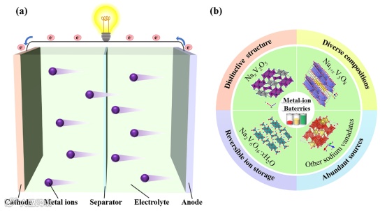 图1. (a)MIBs的工作机理示意图,(b)钒酸钠在MIBs中应用的概览图。