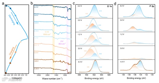 图4. 电化学机制:(a) BTT-PTO-COF充放电曲线;(b) 非原位FT-IR图谱, (c) 非原位XPS O 1s谱图;(d) XPS P 2p 谱图。